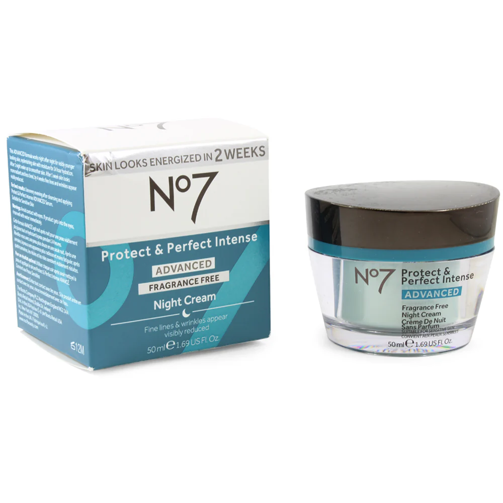 Boots No. 7 50mL Protect & Perfect Intense Advanced Night Cream Fragrance Free for ages 30-45 is formulated to target the first signs of ageing and is a rich moisturizing night cream that works while the skin is at rest to help restore the skin and replace lost moisture overnight. Reduces the appearance of deeper lines, wrinkles and firms the skin. This advanced anti-aging cream works night after night to revitalise the appearance of skin with radiance-boosting ingredients and replenishing, 24-hour hydration With Vitamins A, C and E for a refreshed, radiant complexion and Hyaluronic Acid for lasting, 24-hour hydration.