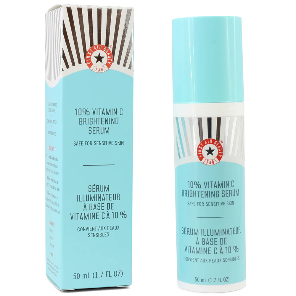 First Aid Beauty 10% Vitamin C Brightening Serum is a radiance boosting serum that visibly firms and makes skin look brighter and feel firmer. It contains colloidal oatmeal and squalene, does not feel sticky or have the smell typical of Vitamin C. It is lightweight is safe for sensitive skin.