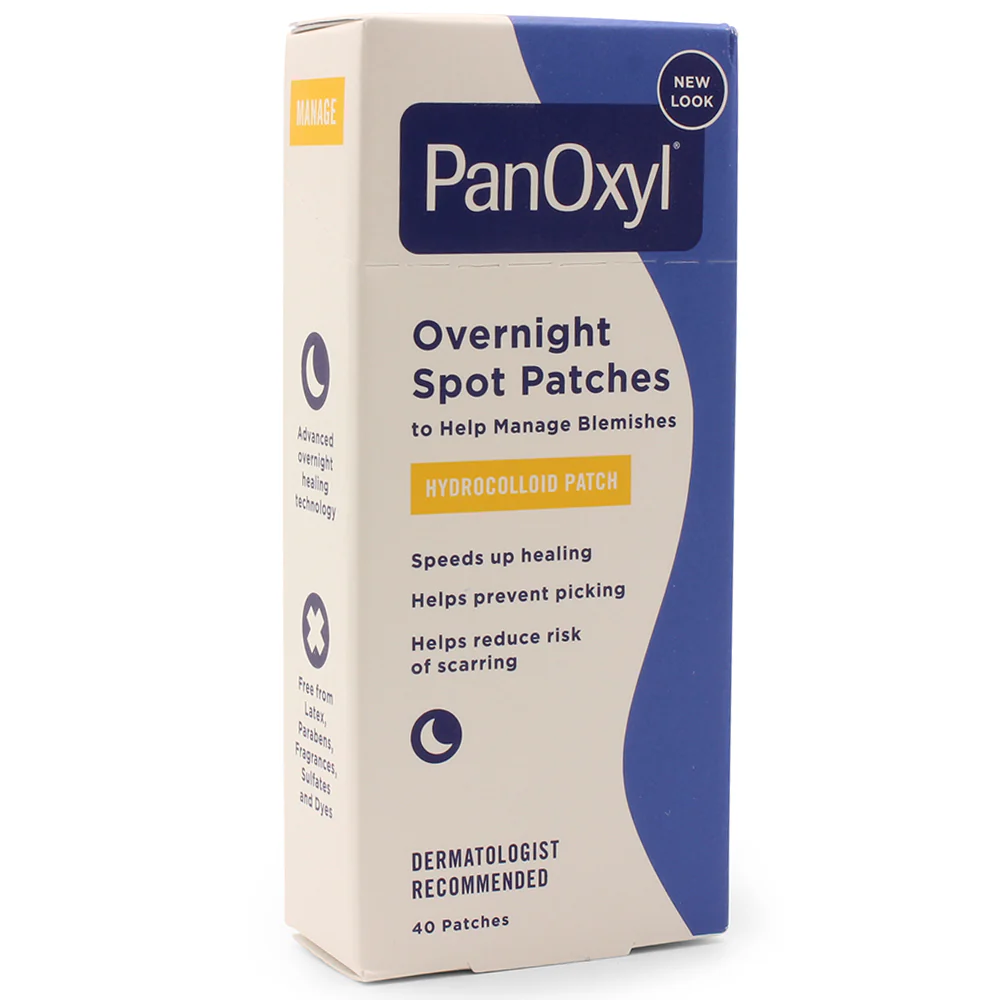 PanOxyl PM Overnight Spot Patches are latex-free hydrocolloid patches that are safe for all skin types and designed to help protect skin, heal spots and prevent picking, which can lead to scarring.