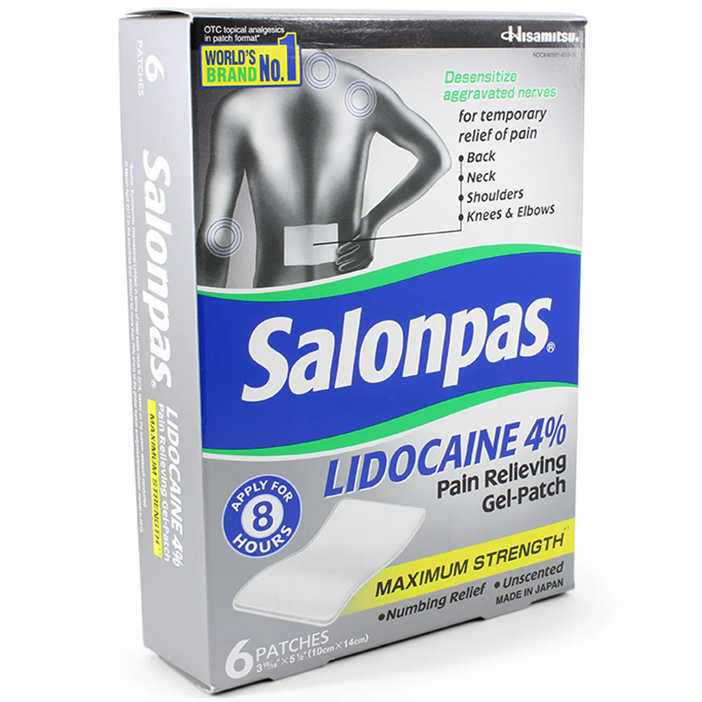 Salonpas Lidocaine Pain Relieving Gel-Patch is the latest innovation from the world’s leader in medicinal pain patches. Salonpas® Lidocaine Pain Relieving Gel- Patch provides temporary relief of pain associated with back, neck, shoulders, knees and elbows. Salonpas® Lidocaine Pain Relieving Gel-Patch is not indicated for post-herpetic neuralgia.